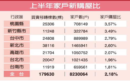 半年房市交易活絡,信義房屋根據內政部資料統計全臺都會區家戶新購屋比率,桃園平均1千戶家庭中就有35.7戶在上半年新買屋,是買屋最熱絡的區域。排名第二則是新竹縣市,每千戶就有34戶買屋;臺北因房價太貴,買屋不熱絡,每千戶只有19戶在上半年買屋,僅次于臺南市的18戶。家戶新購屋比率,是指區域家庭新購屋的比率。計算方式是以內政部提供的同一段期間內建物買賣移轉棟數,除以同時間的家戶數。