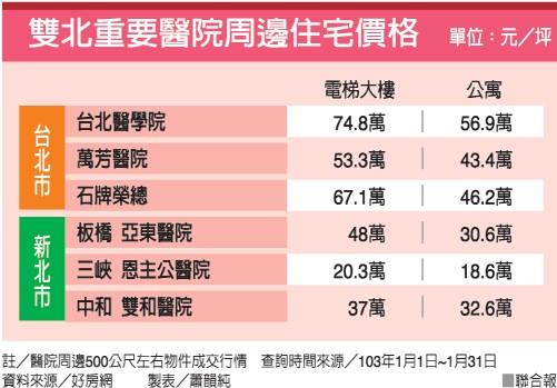 黃舒衛表示,萬芳醫院交通便捷,鄰近文山運動中心,但與大安區房價相比,至少低了3成。北醫周邊房價較臺北市均價便宜1成;不過北醫周邊的屋齡較老舊,且以老公寓為多。黃舒衛也推薦板橋區的亞東醫院、中和區的雙和醫院;亞東醫院附近房價較新板特區便宜,因具有土地變更、活化的題材,這2年已經漲了3成;雙和醫院鄰近景安捷運站,環狀線完工后,可享有雙捷運的交通優勢,房價仍有成長空間。
