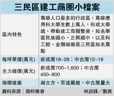 區域現況:信義房屋主管說,三民區商圈地廣人口密集,以自住型客戶居多,長期以來也是高雄交易移轉的最大宗。商圈中舊部落,建商也整合開發蓋大樓及社區別墅,建工商圈有著強大發展潛力,新建案每坪18萬至28萬元;中古屋12萬元至18萬元,可參考輕軌公車系統及鐵路地下化議題,買進具增值、抗跌產品。