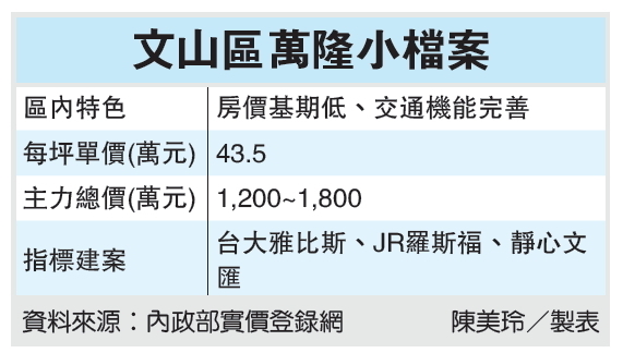 區(qū)域現(xiàn)況:萬隆生活圈,目前舊公寓約占住宅產(chǎn)品的六至七成,其中以羅斯福路五段為??界,分為東西兩區(qū)塊,又以羅斯福路五段房?jī)r(jià)最高,除了生活機(jī)能較方便,近捷運(yùn)與公車站牌也是主要因素,公寓每坪成交價(jià)約41.7萬臺(tái)幣、電梯大樓53.8萬臺(tái)幣,而羅斯福路六段公寓單價(jià)大約38.5萬臺(tái)幣、電梯大樓53.2萬臺(tái)幣。至于羅斯福路五段以西,每坪價(jià)格比東側(cè)略高,以東則多為公寓產(chǎn)品及老舊社區(qū),住宅較為密集,公園綠地不若西邊多,根據(jù)實(shí)價(jià)資訊,興隆路一段公寓價(jià)格大約40.7萬臺(tái)幣、電梯大樓48.9萬臺(tái)幣,興隆路二段公寓價(jià)格大約41.7萬臺(tái)幣、電梯大樓則來到46.1萬臺(tái)幣。