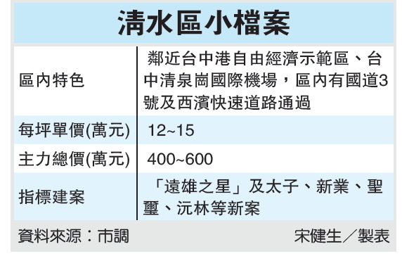 區域現況:屬于海線的清水,過去推桉多由在地建商經營,清一色以別墅為主流,每戶總價在1,000萬臺幣左右。隨著遠雄、太子等大型建商進駐,推估未來此區預售屋將以大樓首購宅為主,主力總價介于400萬至600萬元間。