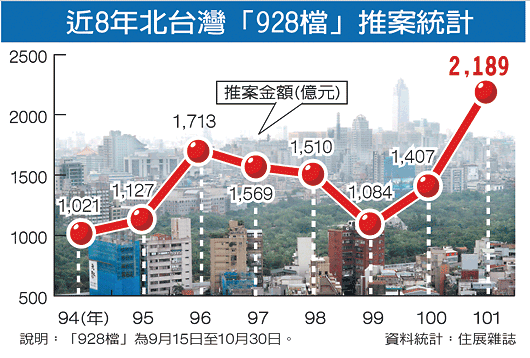 從本周六(9月15日)起至10月30日為止的928檔期,是房市傳統(tǒng)3大檔期,也是年度最后一個(gè)檔期。根據(jù)住展雜志統(tǒng)計(jì),今年928檔北臺(tái)灣案量在10億元以上指標(biāo)建案,共54個(gè),其中新北市20個(gè)最多,桃園14個(gè)、新竹11個(gè),北市則有9個(gè)指標(biāo)建案。總計(jì)北臺(tái)灣今年928檔共有2189億元案量,較去年的1407億元,大增782億元、增幅達(dá)55.5%,是自2005年以來,928檔最大推案量。