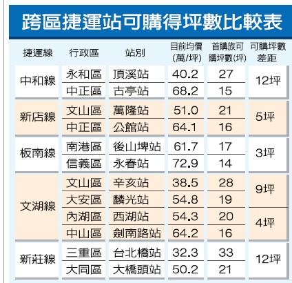 好房網表示,調查顯示,「跨區又跨市」的捷運站,價差最明顯,首購族也最能增加購得坪數,除古亭、頂溪站外,新莊線的「臺北橋站」和「大橋頭站」,可購得坪數也同樣有12坪??的差距,在北市