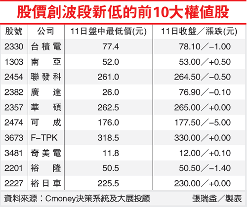 臺股上周反彈后拉回、指數連跌4天之后,昨(11)日終于止跌,以7,257點作收,上漲6.56點,但盤中有臺積電等多達165檔個股創近期波段新低。