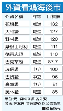 鴻海昨 (13)日公布優異的第三季營運成績,營益率達3.4%,輕松擊敗市場原先預期的數字2.3%。鴻海繳出亮麗的成績單,外資紛紛出具報告給予鴻海中立到喊進的評等,其中花旗證券、大和證券、野村證券分別給予132、127與120元的目標價。眾家外資中只有美林證券喊空鴻海,因為認為iPad mini推出將蠶食iPad市場、影響鴻海營收,因此喊空鴻海但調升至85元的目標價。