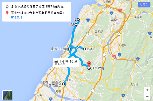 第一天:A.國道三號通霄交流道 27.3km B.馬家莊 5.3km C.虎頭山 8.5km D.通霄精鹽場 2.6km E.白沙屯拱天宮 19.4km F.飛牛牧場