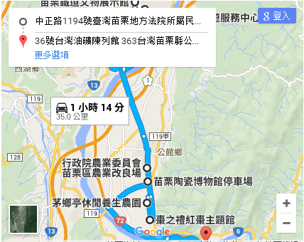 A.國道一號苗栗交流道 37.3km → B.苗栗縣旅游服務中心 19.8km → C.玉清宮 1.6km → D.維新客家文物館 1.2km → E.苗栗文昌祠 2.4km → F.鐵道文物展示館 2.9km → G.貓里山自行車道 2.3km → H.苗栗區農業改良場 9.4km → I.苗栗陶瓷博物館 0.8km → J.黃金小鎮休閑農業區 2.0km → K.棗之禮觀光工廠 3.5km → L.臺灣油礦陳列館 2.3km → M.建議住宿公館鄉或汶水