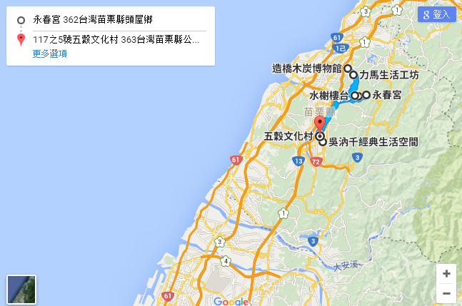 第二天:A.永春宮 2.9km B.明德水庫/日新島 0.8km C.薰衣草森林公園 11km D.力馬原住民生活館 1.4km E.木炭博物館 20.7km F.苗栗碧多妮蠶絲廠 2.0km G.五榖文化村