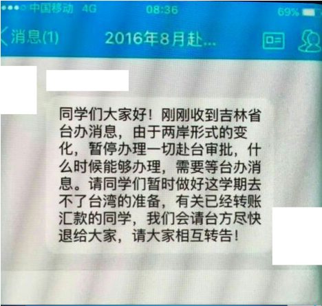 陳姓讀者表示,他認(rèn)識(shí)一名在臺(tái)灣念書的中國留學(xué)生,這名陸生的友人本來也申請(qǐng)要來臺(tái)留學(xué),最近卻被中國的校方外事處告知由于兩岸情勢(shì)變化,(臺(tái)辦)暫停一切赴臺(tái)審批,什么時(shí)候能夠辦理,需要等臺(tái)辦消息。無法來臺(tái)的友人于是截下簡訊畫面,告知人在臺(tái)灣的同鄉(xiāng)他來不了了。這位讀者覺得這樣的政治干預(yù),讓人難以認(rèn)同,他認(rèn)為,教育應(yīng)該歸教育,不應(yīng)該有意識(shí)形態(tài)或政治介入。