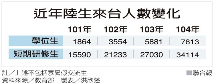教育部統計,去年四萬多名陸生在臺求學,其中三萬四千多人是短期生。不少私校指出,陸生若減少,除了影響交流機會,也會沖擊學校財務。