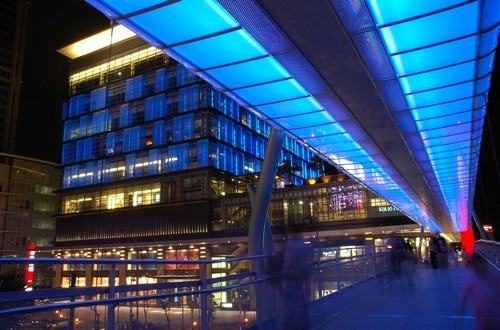 【信義空橋】 宛如太空艙設計的頂蓋,入夜后幻彩的燈光形成均勻的發光體,為信義區的夜景增添浪漫風采。