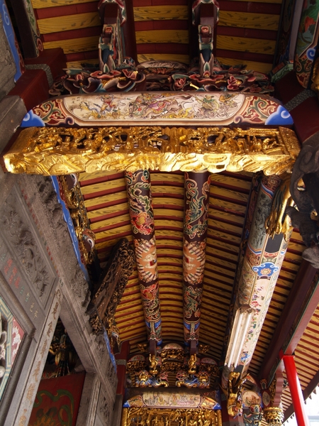 艋舺清水巖祖師廟不同于一般廟宇坐北朝南的風水,整體建筑為坐東朝西,南殿兩側龍虎墻上有磚刻圖案;艋舺清水巖內存有翁有來、翁有麟敬立的石柱楹聯(lián):『為清水,為蓬萊,此地并分 法界;是金身,是鐵面,入門便見真容』以及前殿檐廊左墻上的磚雕為嘉慶22年的遺物,其它大多為同治6年以后所做;艋舺清水巖祖師廟原有三殿,后殿倒塌后現(xiàn)存為三開間兩進兩廊兩護龍的殿宇建筑,前殿計開三門,屋頂用硬山翹脊,中門前立石鼓并有粗壯的蟠龍石柱一對構成入口檐廊;檐廊兩側山墻的磚雕圖案上,額題嘉慶丁丑年桐月吉旦;正殿采用硬山翹脊屋頂,拜殿也有粗壯的蟠龍石柱一對,為同治7年戊辰(公元1868年)所立,所有的建筑文物都代表著艋舺清水巖所經歷過的歷史歲月。