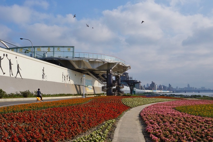 大稻埕碼頭向北騎單車約10分鐘可到達,花海采用當季5萬多株草花,光是海棠就有紅、桃、粉、白色4種顏色,還有紫色鼠尾草和黃色波斯菊與勛章菊,交織出色彩繽紛的帶狀花海,而且透過波浪線型圖騰,更能呈現水岸公園特色景觀。即日起到12月下旬是盛花期,水利處提醒民眾要把握最佳時機。