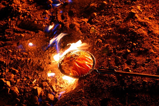 北投酒家菜,將傳統食材加入新的創意,是作工繁復的手工菜。以豬油網包覆咸蛋黃、蝦漿、花枝漿及荸薺,塞入開背的大蝦中,每一口都是絕美新鮮的海味,具有將滿滿的好運一網打盡的吉祥涵義。