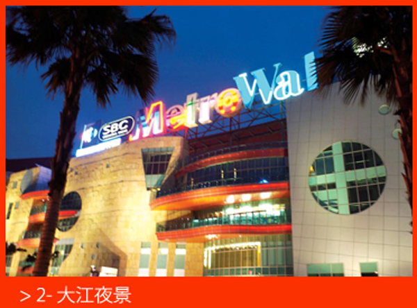 大江購物中心內店家包羅萬象,食衣住行吃喝玩樂樣樣不少,180個國際名牌時尚精品齊聚;SBC、SEGA等視聽娛樂空間;屈臣氏、生活工場(旗艦店)等居家名店,絕對滿足各個消費群的購物
