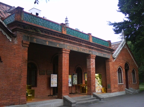 理學(xué)堂大書院,英文名字為「 Oxford College 」(牛津?qū)W堂) 。1872年到1880年間,馬偕博士以露天教學(xué)的方式,于路邊、榕樹下、溪邊或是海邊傳教,因感于創(chuàng)校之重要性,便于1880返回英國之際,籌募款項(xiàng)?;氐降蟊汩_始興建學(xué)校?!概=?qū)W堂」于1882年落成,是當(dāng)時(shí)教會(huì)培訓(xùn)傳教、醫(yī)療、教育等人員的基地。馬偕為了紀(jì)念英國人的支援,乃以其故鄉(xiāng)郡名「牛津」來命名,以示飲水思源之意。牛津?qū)W堂頗富中國傳統(tǒng)建筑色彩,采用均衡對稱,坐北朝南,同時(shí)屋脊立有八座小佛塔,以代替十字架。牛津?qū)W堂是當(dāng)時(shí)教會(huì)培訓(xùn)傳教、醫(yī)療、教育等人員的基地,目前已被列為二級古跡。