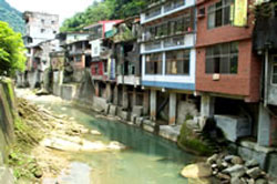 來(lái)到東街第一個(gè)映入眼簾的是這里很特別的建筑─吊腳樓,過(guò)去在山區(qū),人們?yōu)榱税逊课萁ㄖ诶硐氲牡胤剑袝r(shí)不得不將建筑的一部份懸空撐起,所以石碇東街靠溪側(cè)的房子都用柱子支撐起來(lái),由日據(jù)時(shí)代保留至今,成為別具特色的建筑,內(nèi)不相通的騎樓宛如不見(jiàn)天街。暗街上多為住家,僅少數(shù)藝鋪特產(chǎn)店進(jìn)駐,是游客必訪之地。
