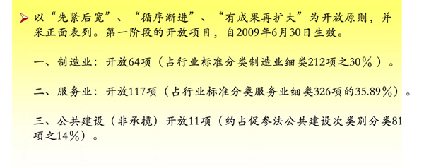 以先緊后寬、循序漸進(jìn)、有成果再擴(kuò)大為開放原則,并采正面表列。第一階段的開放項(xiàng)目,自 2009 年 6 月 30 日生效。