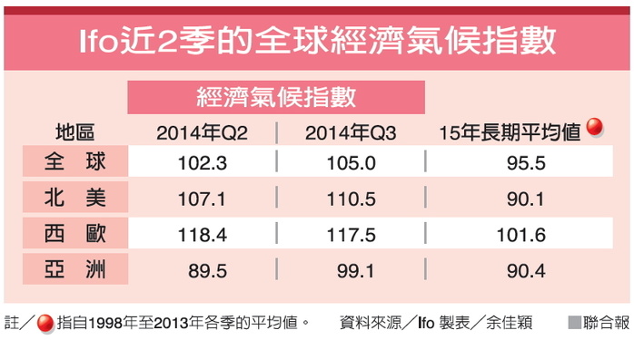 德國經濟研究院(Ifo)昨天發布報告,第3季全球經濟氣候指數為105.0,較上季102.3上升2.7點,不但連3季上升,也創下2011年第3季來新高,代表全球景氣將持續復蘇,也預期臺灣經濟未來6個月將持續呈現轉好。