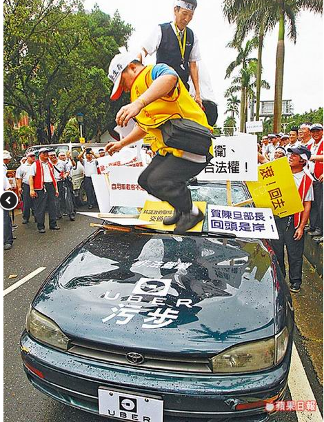 UBER的出現已嚴重擠壓計程車業者,近千輛計程車上月群情激憤包圍立院,運將高喊求生存,并怒砸印有UBER污步字樣的轎車泄憤。經濟部投審會當時即表示,依法最重可撤銷其在臺投資許可。